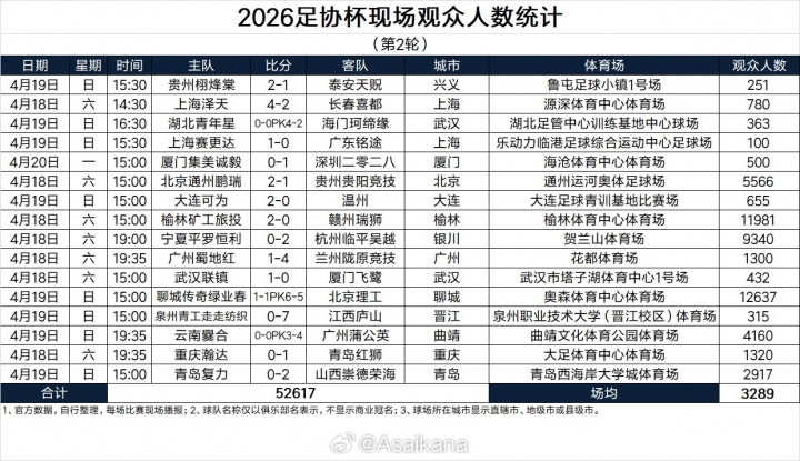 2026足协杯现场观众人数统计(第2轮)